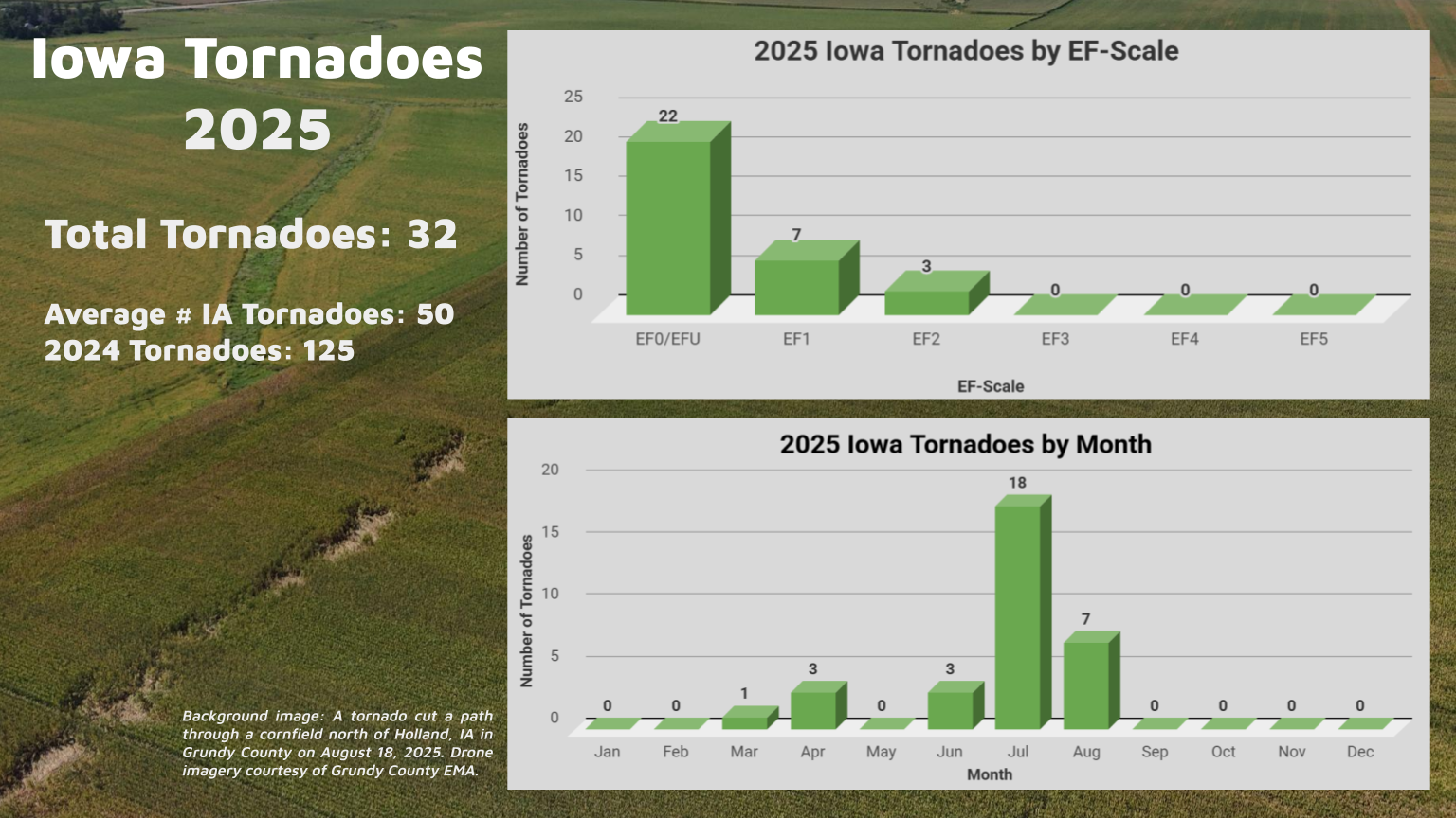 The final tornadoes of the year occurred in August, with several tracks remaining entirely in open farmland. On August 18, three tornadoes touched down in Grundy County, all of which stayed in cropland and caused no structural or tree damage. Drone imagery from that event showed a visible tornado track cutting through a cornfield north of Holland.